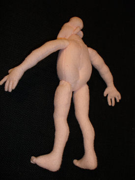 Born from a pattern by Priscella McDonald. He is button jointed at the shoulders and is self standing due to brass rods in his legs and has wired fingers. His fingers are adorned with rings, two on his right hand and three on his left. His face is sculpted and is colored with prisma colored pencils. He has fringe for his hair. His body is sewn from Kona cotton and his legs were made from quilting fabric.