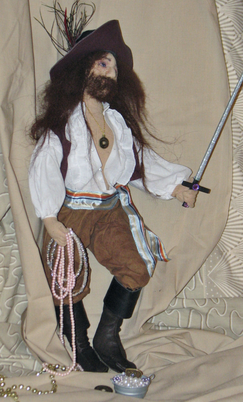 This 17th century Pirate is called 'Rayner' (meaning wise warrior), he has a definite scruffy and un-kept look from not been around civilization a while. He loves his hidden stash of pearls, coins and other jewels but always has his jewel studded sword ready in case of uninvited guests coming on the scene.