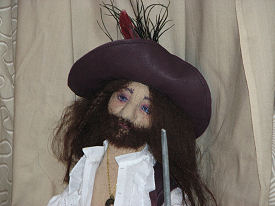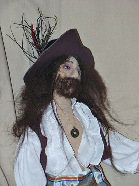 Rayner is from an 18" male doll pattern called "A Dude for All Seasons" designed by Mary Ann Kaahanui and Bonnie B. Lewis. The costume "The Pirate Costume" was designed by Sylvia Schorr. Both patterns are from "Dollmakers Journey".
