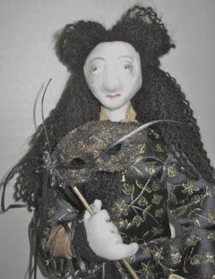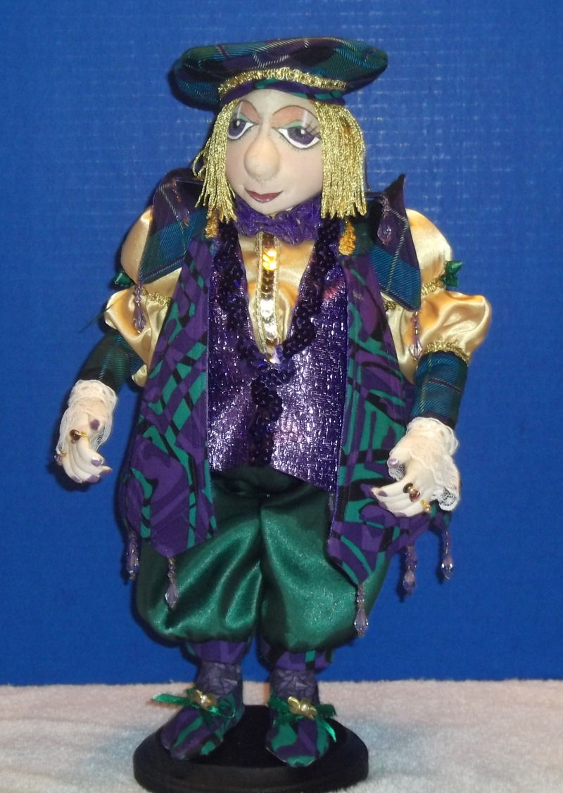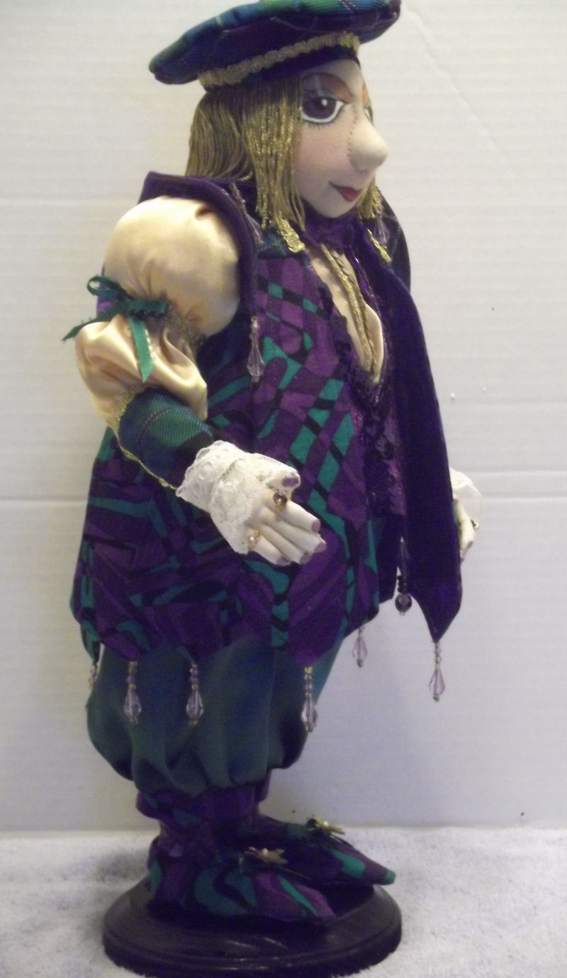 Francis is cloth over armature, the pattern for his body is adapted from a female doll, Shaniqua by Nancy Katz. His face is the same cloth as his body, with clay enhancements and cloth over the clay. The red heels of his shoes were adapted from La Femme by Arley Berryhill. His mask is a pattern by Arley Berryhill, as taught by Nancy Katz. Francis's rings and cravat pin are clay, designed by me to match Francis's dance partner, Francoise (not shown). All of his garments were designed by me using period photographs of Louis XIV and the wedding suit of James II of England.