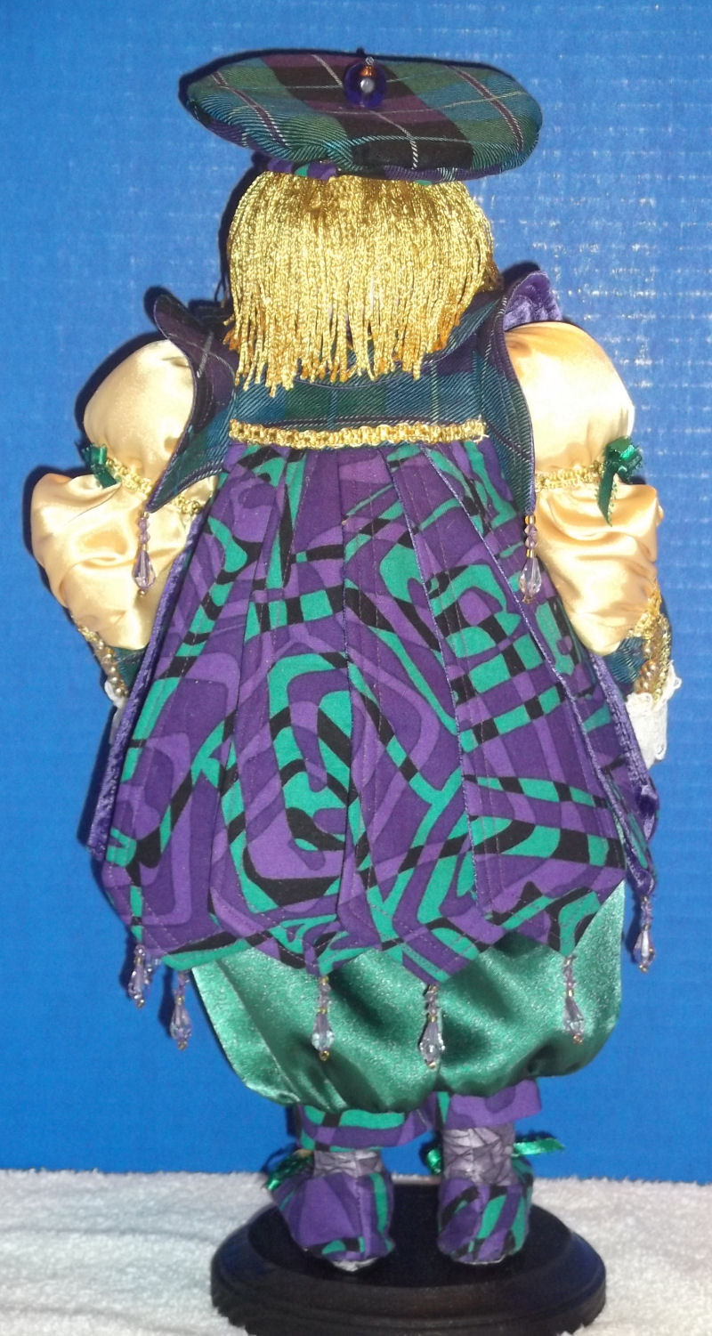 Sir Geoffrey's knickers and shirt is made from satin and trimmed with gold braid, gold sequins, and lace. His vest is sewn from purple costume fabric and lined with satin and trimmed with purple sequins. Lastly, his cloak, hat, and shoes are sewn with quilting fabric. His cloak is lined with purple satin and trimmed in gold braid. He has beading at all points of his cloak, collar, and sleeves.