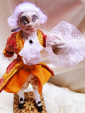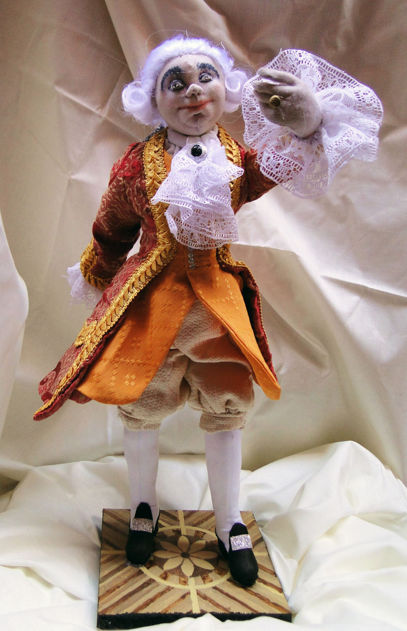M. le Marquis was made in muslin with cotton jersey skin, and wire armature, he is painted with colored pencils, and his outfit is my own design and preparation, it is brocade fabric, embellished with golden trimming, his shoes are leather, he has 18 inches tall not including the base.