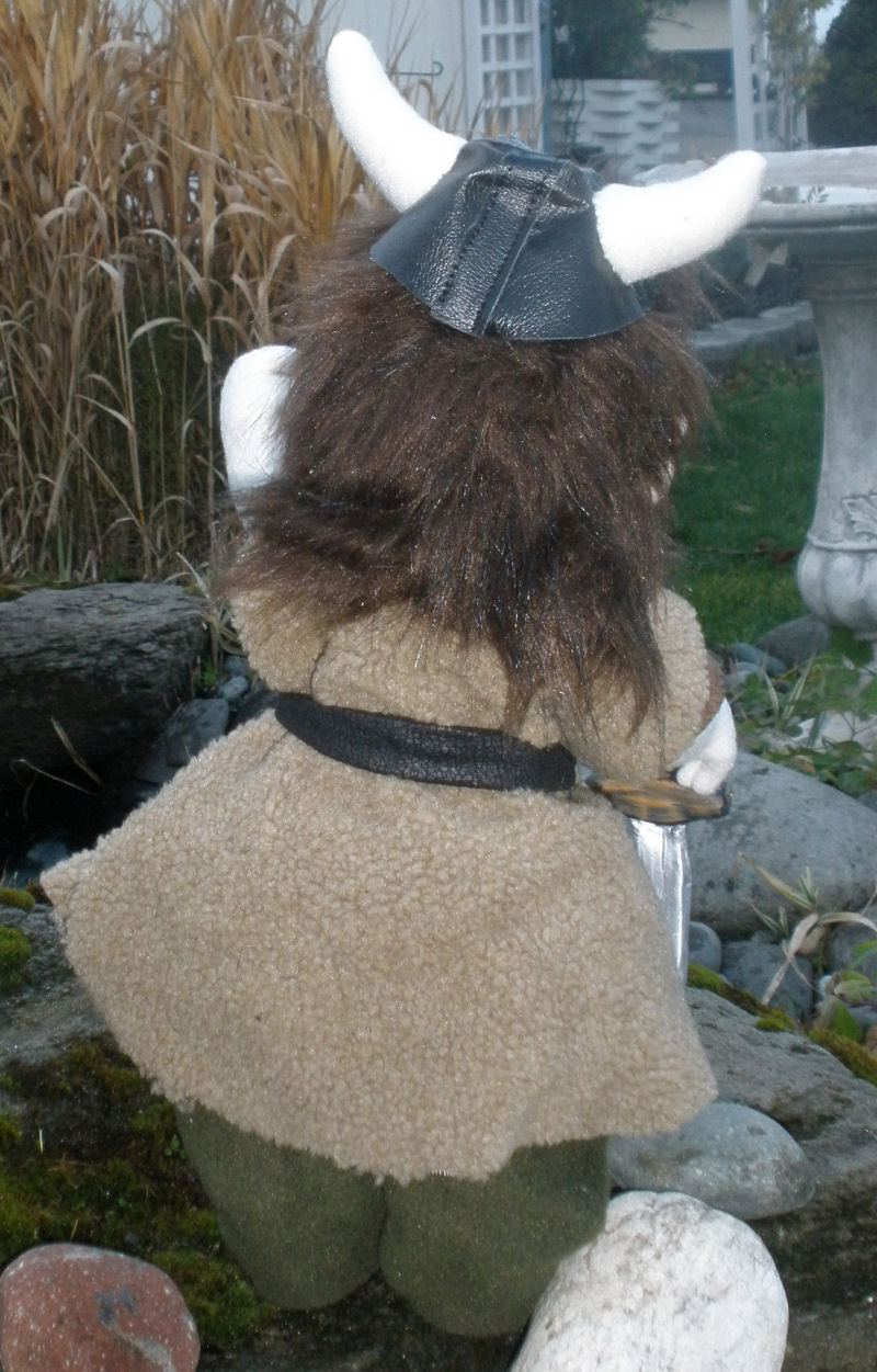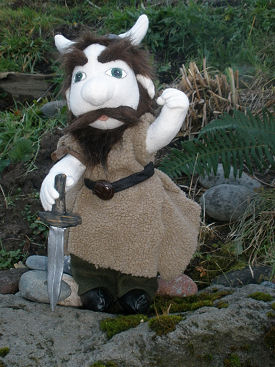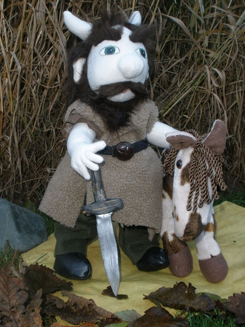 This doll is an original made by me. The pattern I made was inspired by Terese Cato's Gnome pattern that she made for the Soft Doll magazine. My Viking warrior is made of a cream fleece and his clothes are made out of different fleeces, cottons, and vinyl for his shoes and part of his helmet. I used acrylic paints for his face and a long pile fur for all his hair (facial and head). I made his props as well. The horse is made out of a soft fur. The sword was made out of oven bake clay and painted with acrylics.
