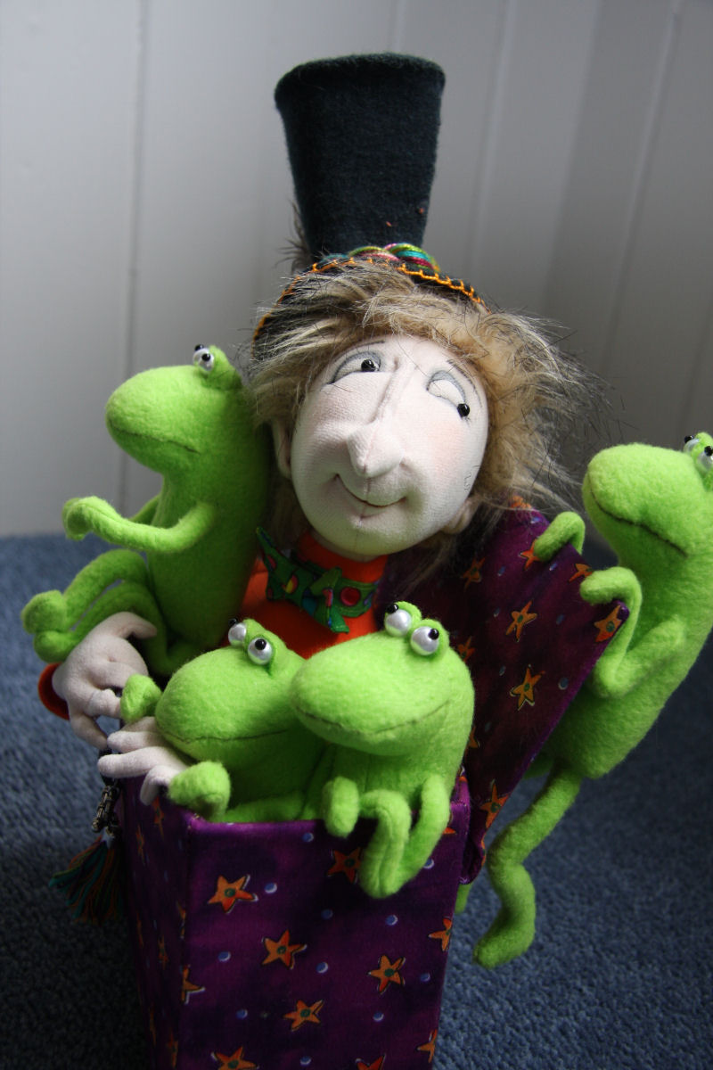 Pattern designed by Jill Maas of 'Slightly Weathered Ladies and More". I have made this doll according to the pattern with just a couple of changes to the construction of his box and of course I have picked my own materials. I also made an extra frog.