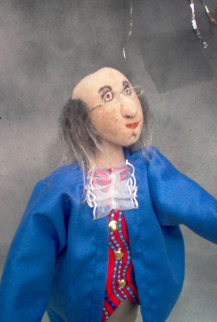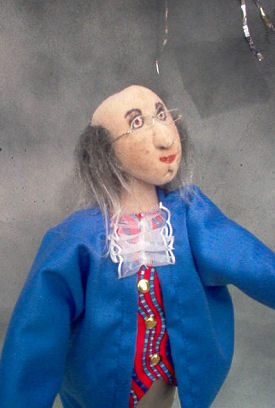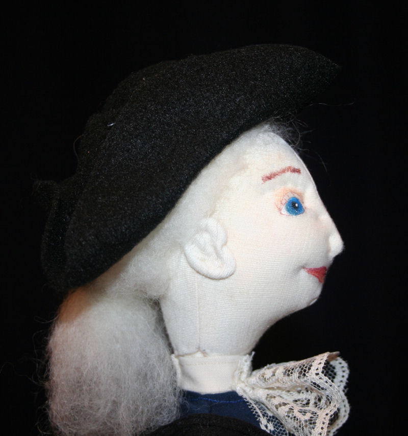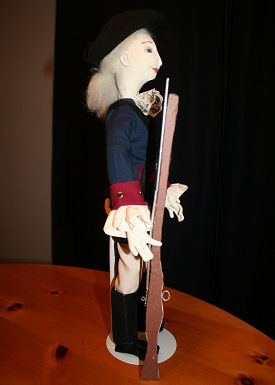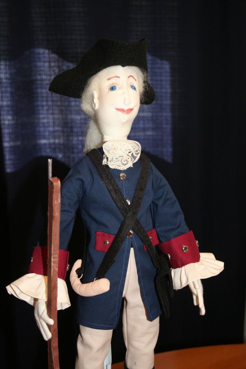 Nathaniel's body is made from a Claire-Ellen pattern. His face is a combination of chalk and watercolor pencils. From his tri-corn hat to his boots, his clothes are originals - no patterns. His black felt hat sits on his needled-felted white wool hair tied in a queue. The navy blue jacket is accented with cranberry cuffs trimmed with silver scrapbooking brads. He's wearing lace at his neck, ruffles on his sleeves, and gloves on his hands. His fawn colored breeches are topped with a black belt and tucked into his tall riding boots. His flintlock rifle is made from a foam core base covered with brown scrapbook paper. Accents were added using a hollow metal rod and jewelry fastenings. The powder horn is made from air dry clay that was painted a flesh color while the black pouch is made from leather like fabric.