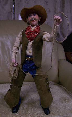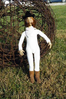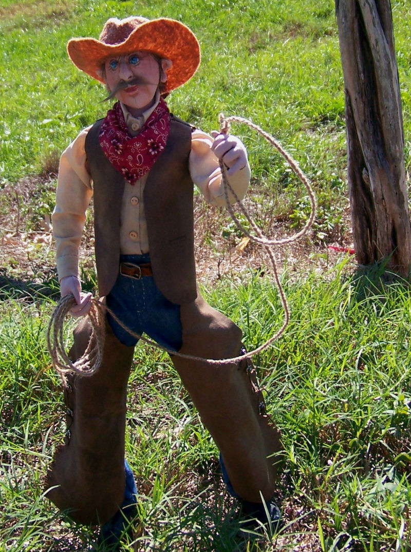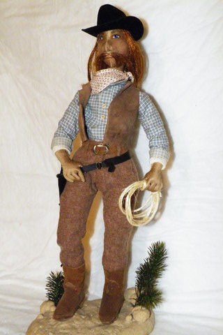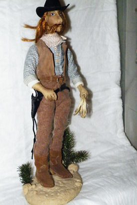 Jake is an original design. His body was made from an old sheet, with his face and arms out of craft velour. Hair is from a Halloween wig and the hat and gun/holster were purchased. His clothing is made from vintage fabrics, his long underwear from knit shop toweling and his boots, belt, vest and hatband from old leather jackets. The gunbelt is vinyl. His platform is a reclaimed old plaque with poly-clay "rocks and soil" and the scrub pine is from an ancient Christmas tree.