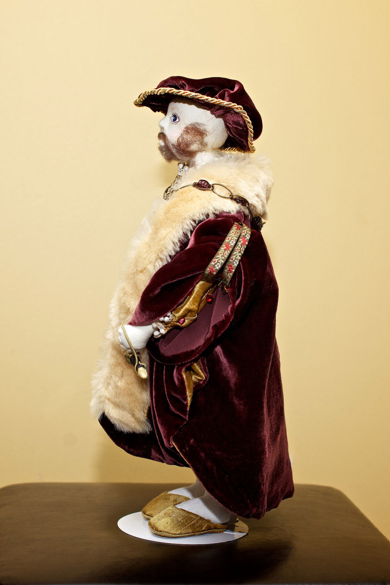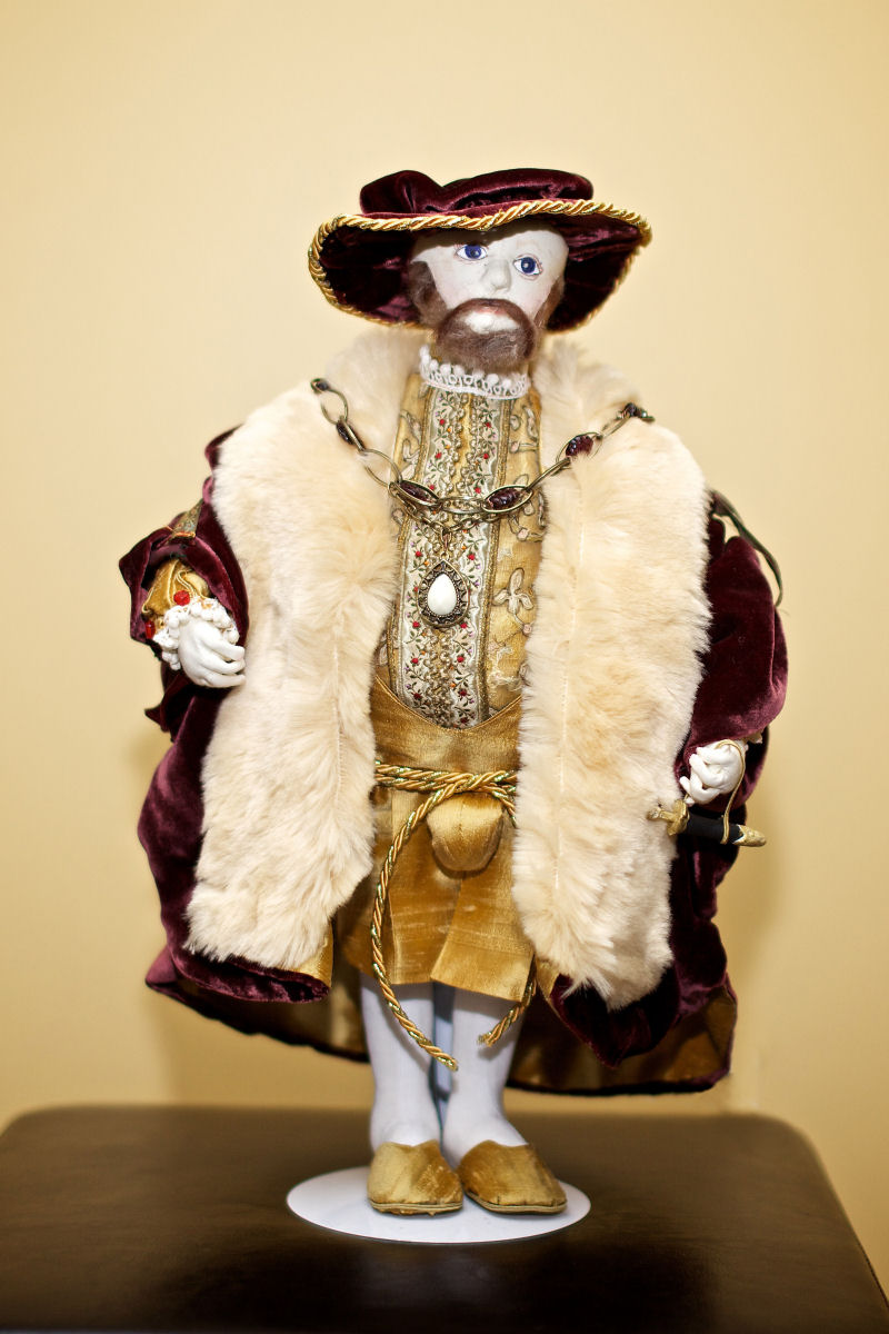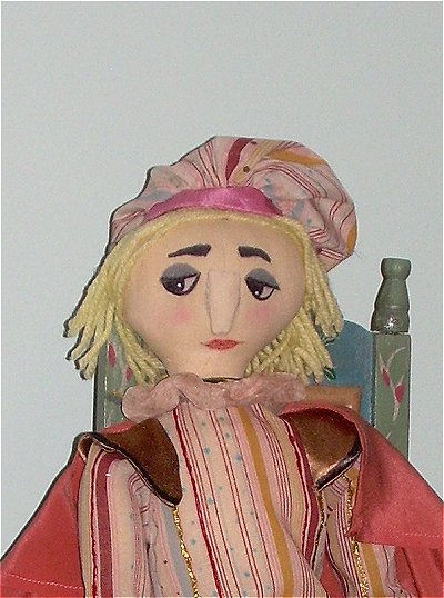 I designed and made this representation of Henry VIII from the 16th century. I made the doll from my basic man pattern enlarging where needed to account for Henry's size. I then draped his clothing with fabric I purchased at a wonderful Vermont fabric store. I have done a lot of costume research for costumes in my past life as a costume maker for theatre so I tried to be accurate in his clothing. He is wearing silk and velvet befitting a king. His trims are vintage pieces I find at auctions and estate sales. As you will notice, his codpiece is prevalent to let his subjects know that he is very powerful.