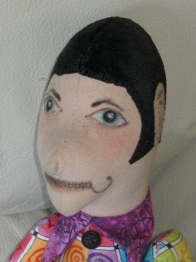 Made of cloth, fiberfill, styrofoam and wire, I used a cold porcelain finish over cloth to achieve the face of the doll. The hair is fiber flocking material and the face is painted with acrylic paints..