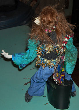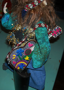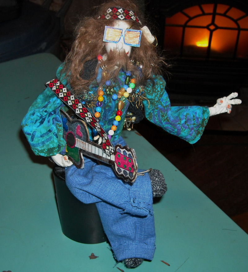 Living during the 60's blue jeans with ratty hems, tie dyed loose shirts, fringed vests, jute belts, boots, sandals or bare foot, love beads, head bands and tinted granny glasses were the clothing my friends and I wore all the time. Using my memories as a guide I dressed my hippie "Taylor Shaughnessy" in similar clothing and added a guitar ( inspired by a photo of a toy one I saw on the internet) made of cardboard. The hair style, loose long and wild was also the norm but free thinking deemed wearing what ever way we chose and I usually wore a single braid in back or my hair loose with it reaching below my waist! Gee...I still wear my hippie clothes my kids tell me...could it be the long flowing dresses, bare feet and hair in a braid in back might be fashionable today? They are to me!