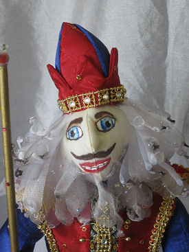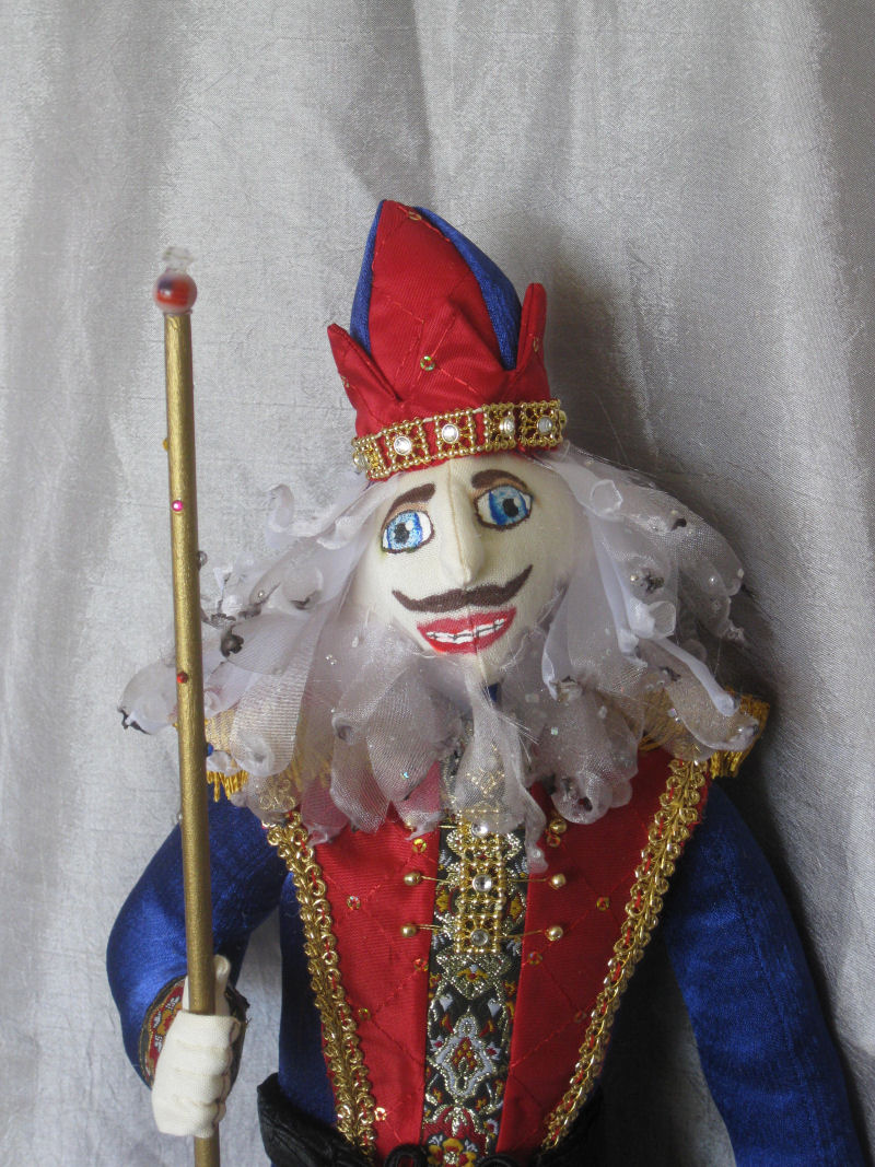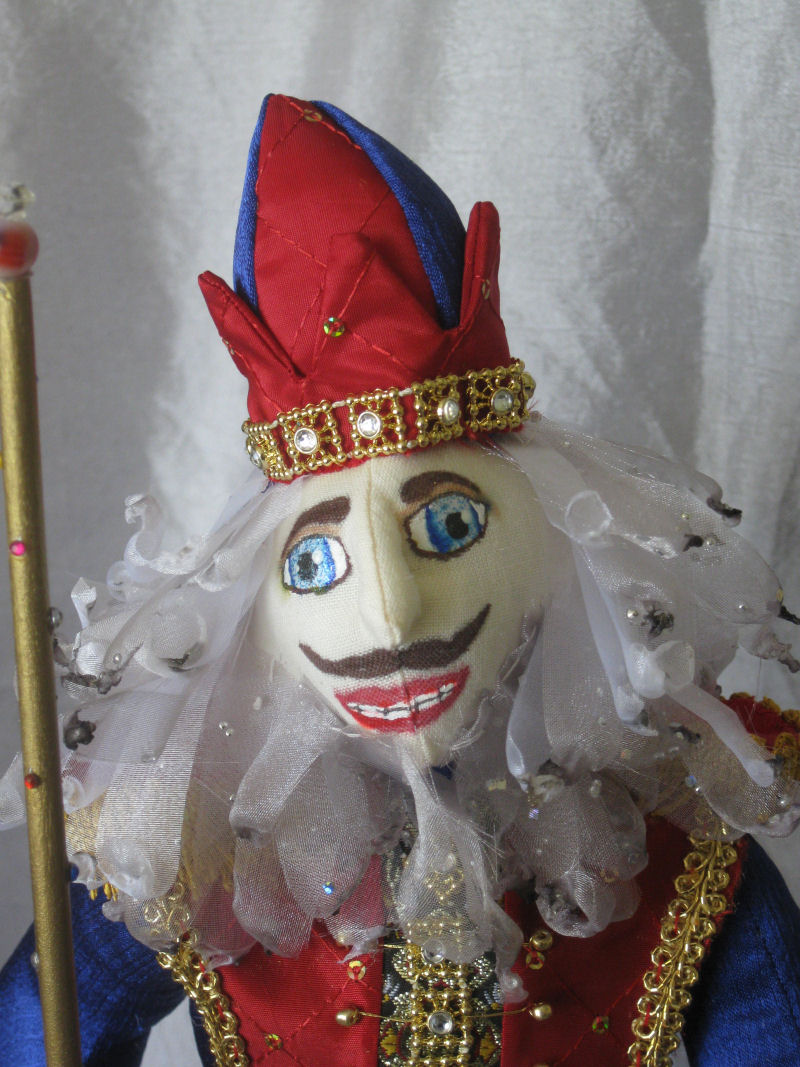 All of his clothes were handmade by me. The Nutcracker will be attending the Christmas Eve party of a wealthy family so he is dressed in elegant rich colors, with extravagant beading. This was the mode of formal dress of the wealthy during that decade.