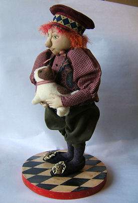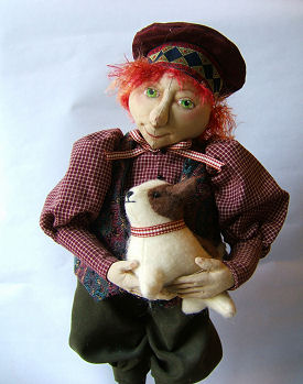 Zeke is made from a pattern by Patti Culea but modified to have a male body and face. Both the arms and legs are wired. All of the clothing is sewn by hand (not machine) including the hat and boots. The hat is formed by needle felting a flat piece of craft felt.
